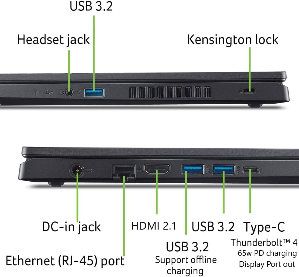 Ports For All Your Accessories: 1 – USB Type-C Port USB 3.2 Gen 2 (up to 10 Gbps) DisplayPort over USB Type-C, Thunderbolt 4 & USB Charging, 1 – USB 3.2 Gen 2 Port (Featuring Power-off Charging), 2 – USB 3.2 Gen 1 ports, 1 – HDMI 2.1 Port with HDCP support, 1 – Headphone/Speaker/Line-out Jack, 1 – Ethernet (RJ-45), DC-in for AC adapter