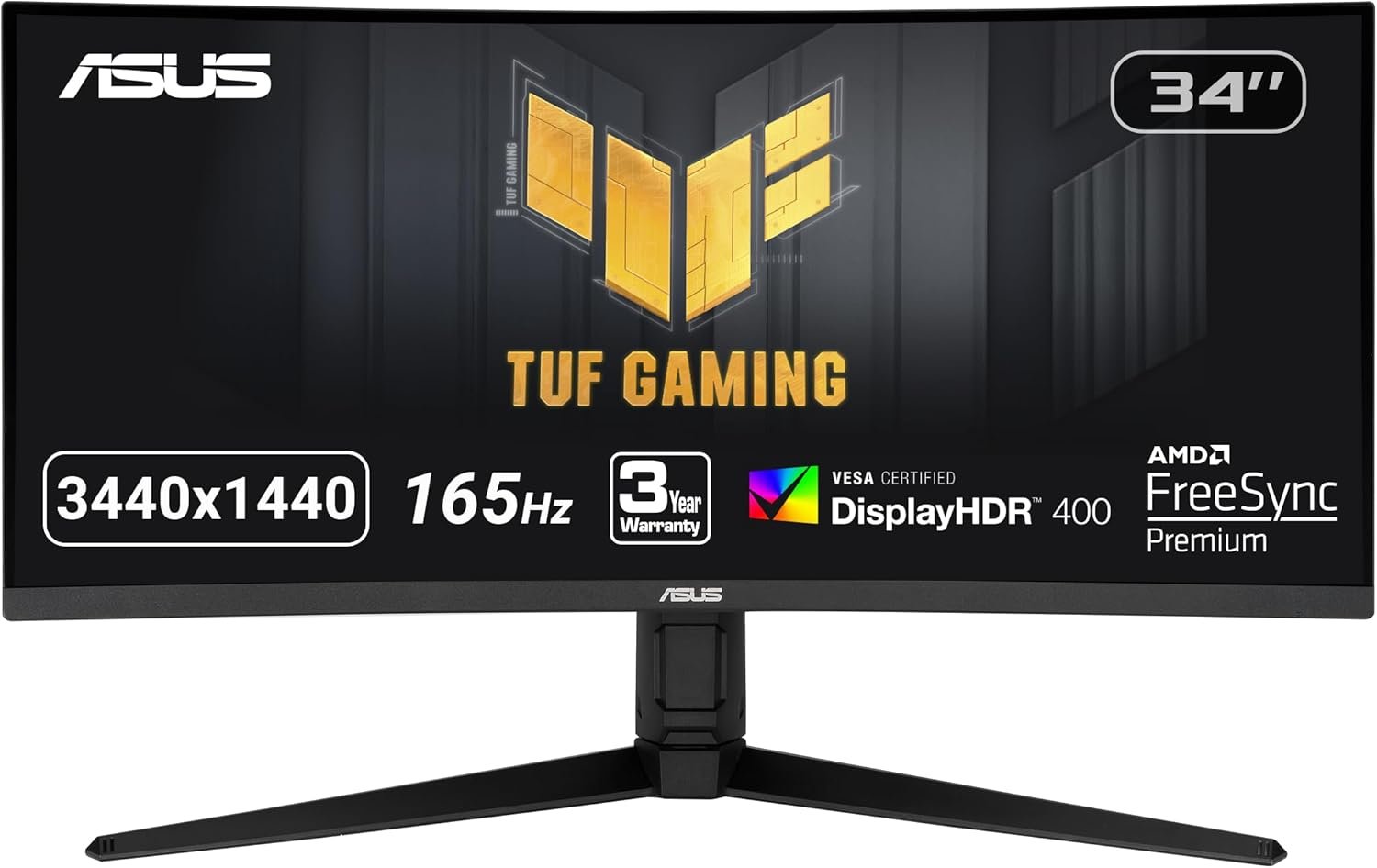 ASUS TUF 34 Inch Curved Gaming Monitor – WQHD (3440×1440), 165Hz, 1ms, Extreme Low Motion Blur, FreeSync Premium, Eye Care, Height Adjustable, DisplayHDR 400, DisplayPort, HDMI, USB – VG34VQL1B