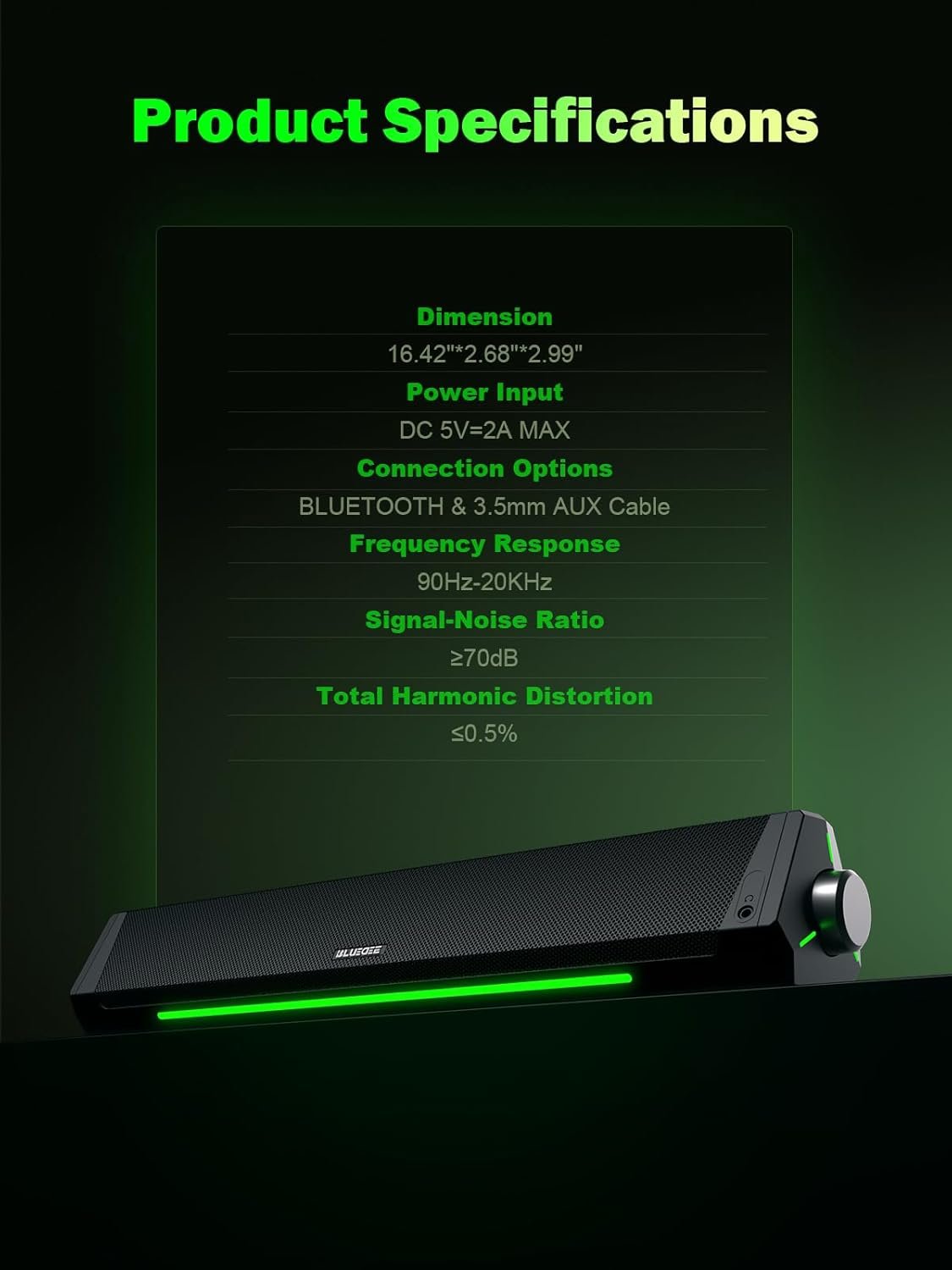 【Compact Profile Design】Slim and futuristic design, which allows the Bluedee computer soundbar to fit neatly below your computer monitor without taking up much desk space; The speaker measures 16.4″ W x 2.6″ D x 2.6″ H.