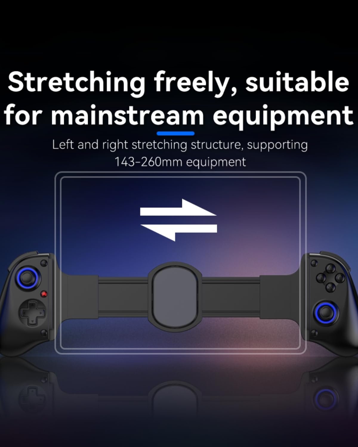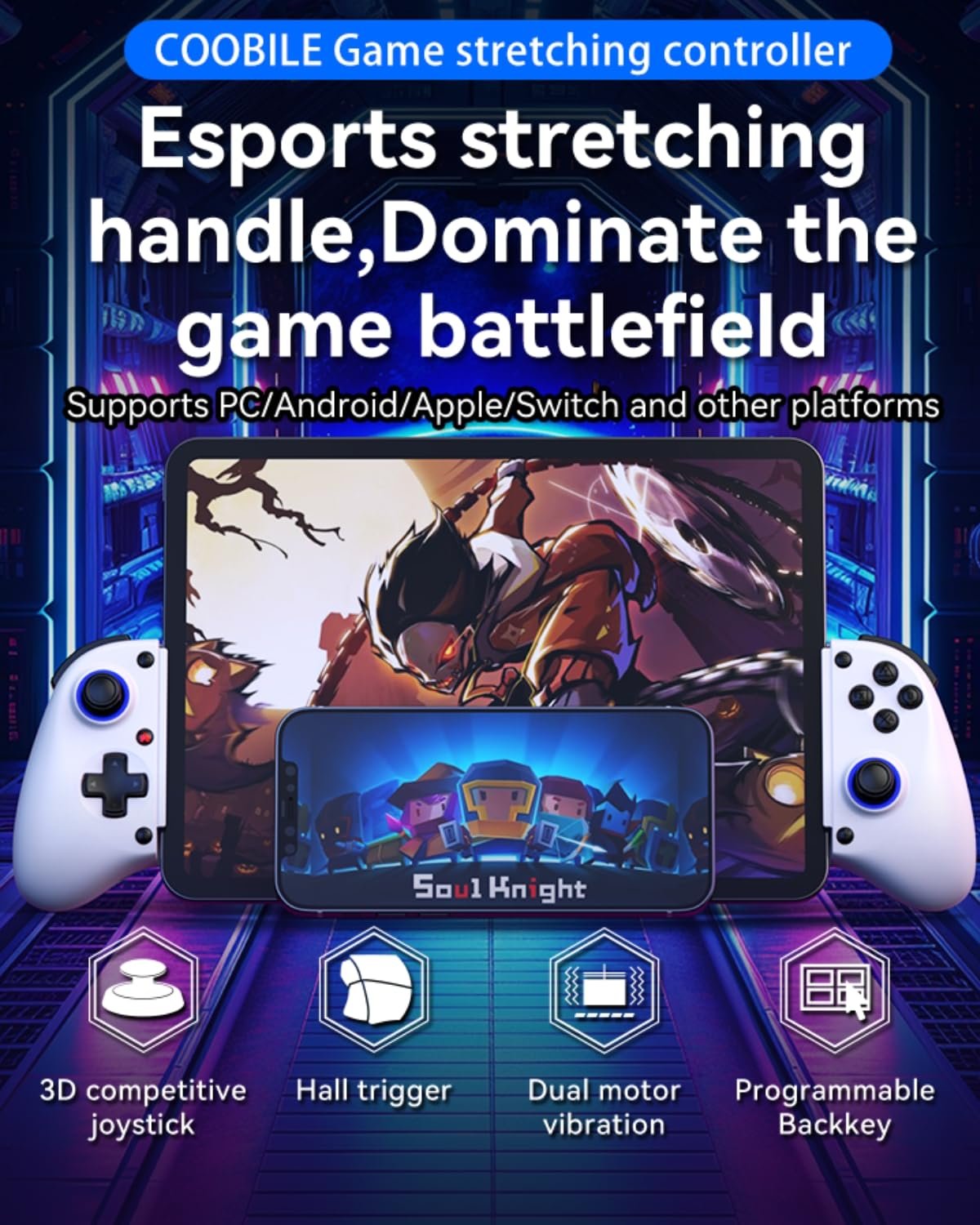 Step up your gaming experience with this versatile COOBILE wireless game controller. Featuring an innovative stretching design that accommodates various device sizes, this controller brings console-quality gaming to your mobile devices. The Hall Linear Trigger technology provides precise analog control, while dual vibration motors deliver immersive feedback during gameplay. The controller includes programmable back buttons for custom macro functions, giving you a competitive edge. Compatible across multiple platforms including iOS, Android, iPad, PC, and Nintendo Switch, this controller adapts to your gaming needs. The 3D competitive joystick ensures smooth, accurate movement control in any game. With its ergonomic design and responsive buttons, this controller is perfect for extended gaming sessions. Whether you’re playing action games, racing titles, or competitive esports, this controller offers the precision and functionality needed to dominate the virtual battlefield.