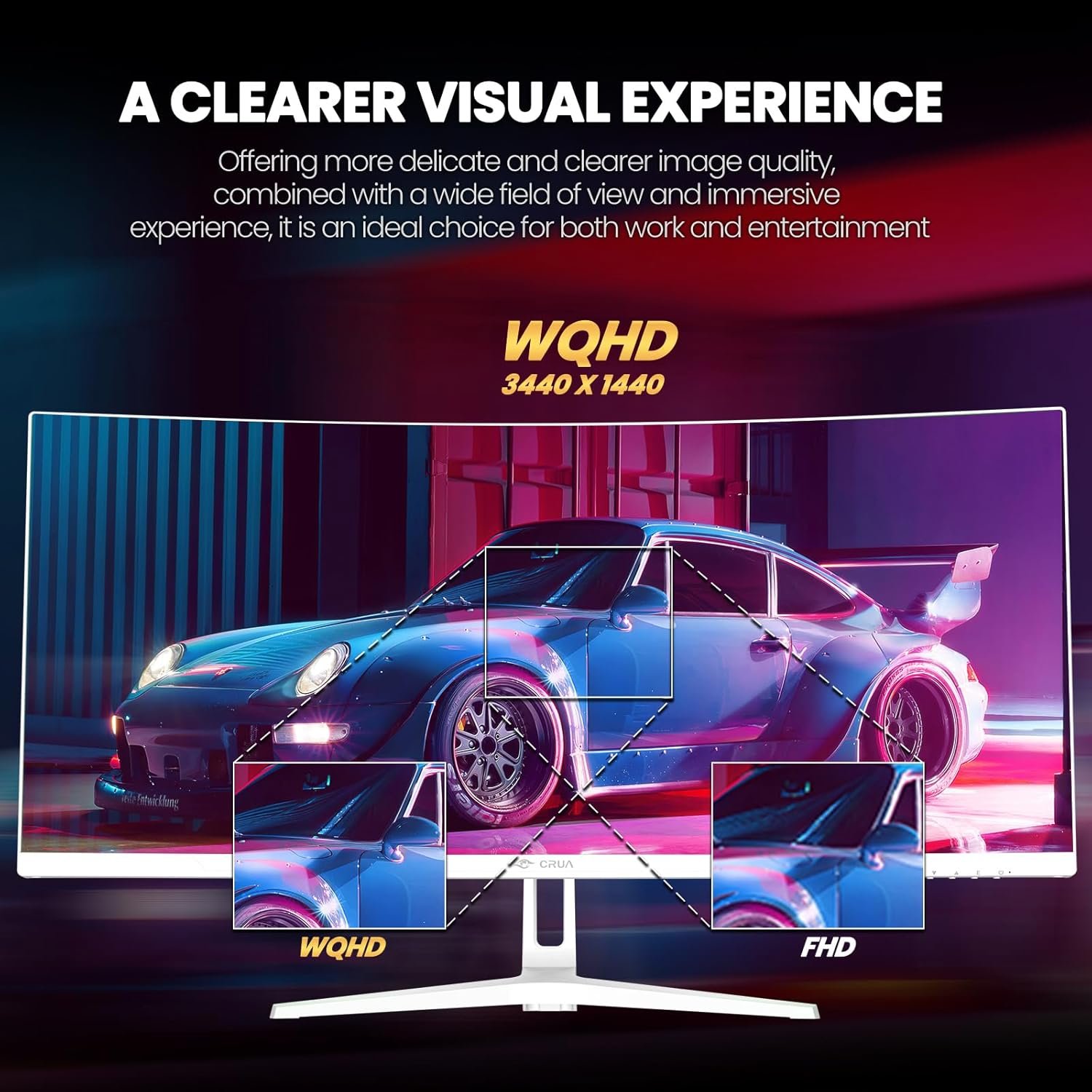 CRUA 34Inch White Gaming Monitor 144hz 21:9 1500R Ultra Wide Curved Monitor, WQHD (3440X1440P) 120%sRGB VA Panel Computer Monitor Support AMD Freesync, HDMI 2.0 & DP1.4, Wall Mountable/Tilt Adjustable