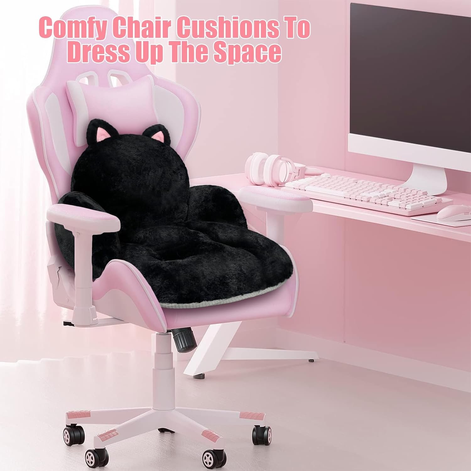 Cute Chair Cushion, Comfy Seat Cushion for Office Desk, Kawaii Chair Cushions for Gamer, Soft Chair Cushion for Room Bedroom Decor(Black Kitty)