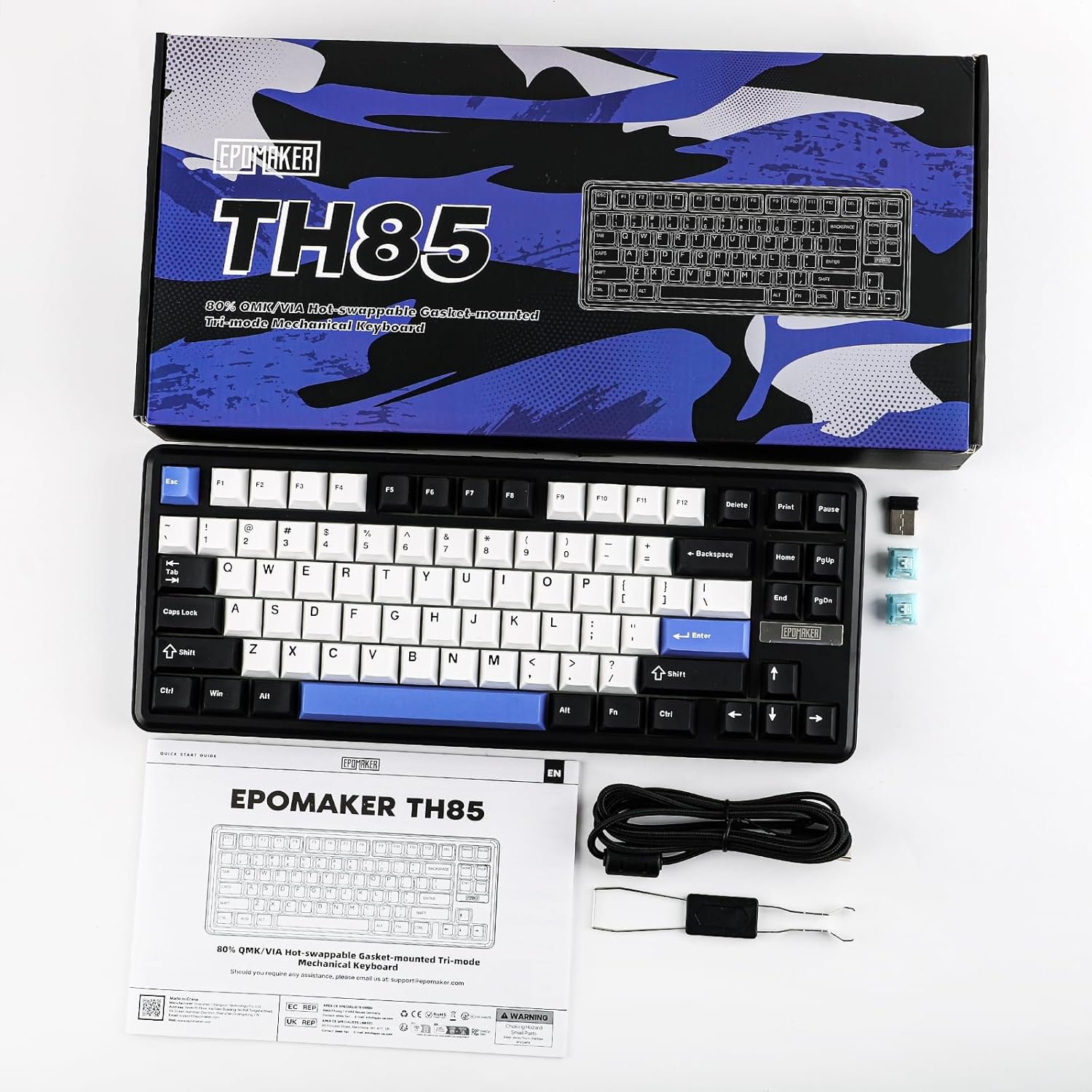 1*Multilingual Manual. 1*Wireless Mechanical Keyboard1*USB A to C Cable. 1*2.4Ghz Receiver Dongle1*2-in-1 Switch-and-Keycap Puller. 2*Extra Switches TH85 Wireless Gaming Keyboard
