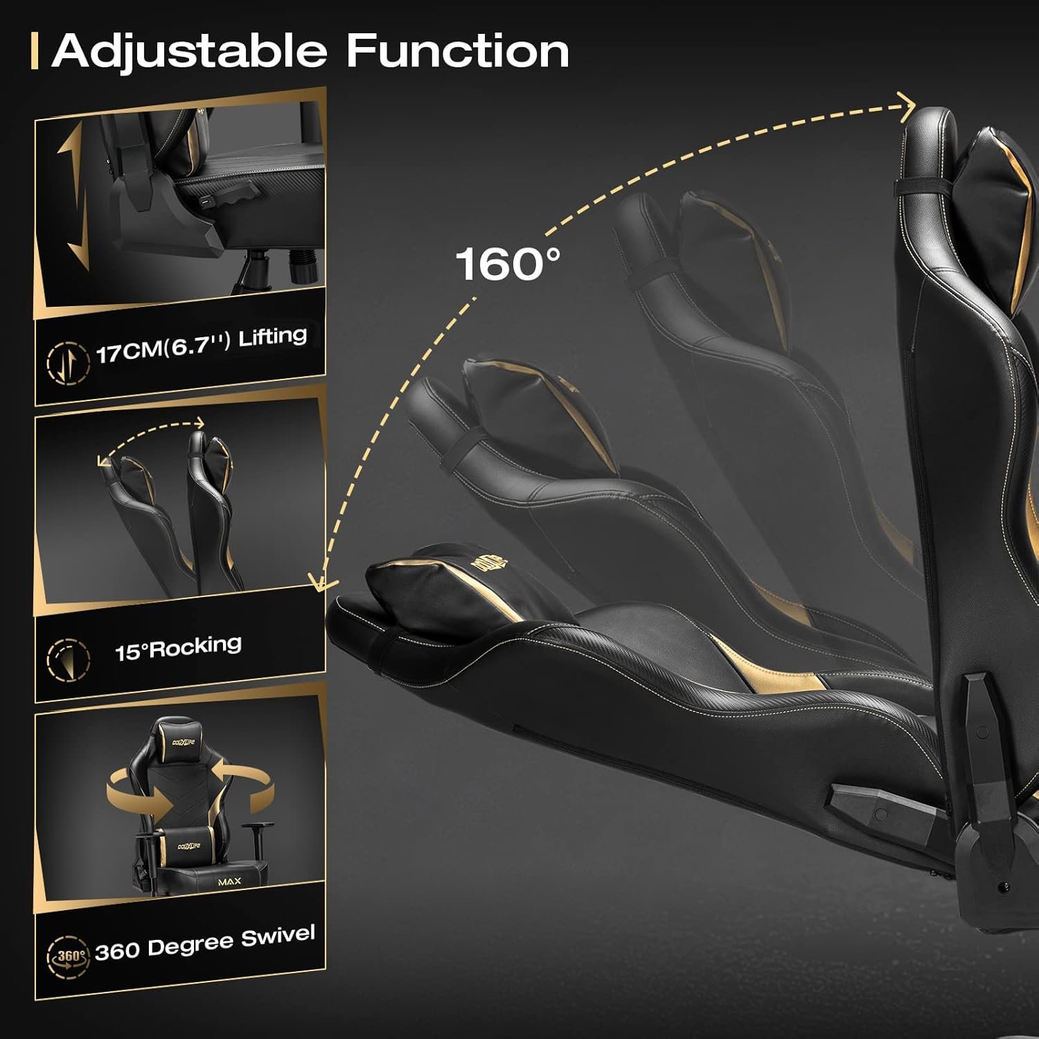 Parameter: 160° Max Reclining Adjustable Seat Height(0-6.7in) 3D Armrests 360 Degree Swivel Adjustable headrest Lumbar Pillow Silent universal wheel Thick Iron Core
