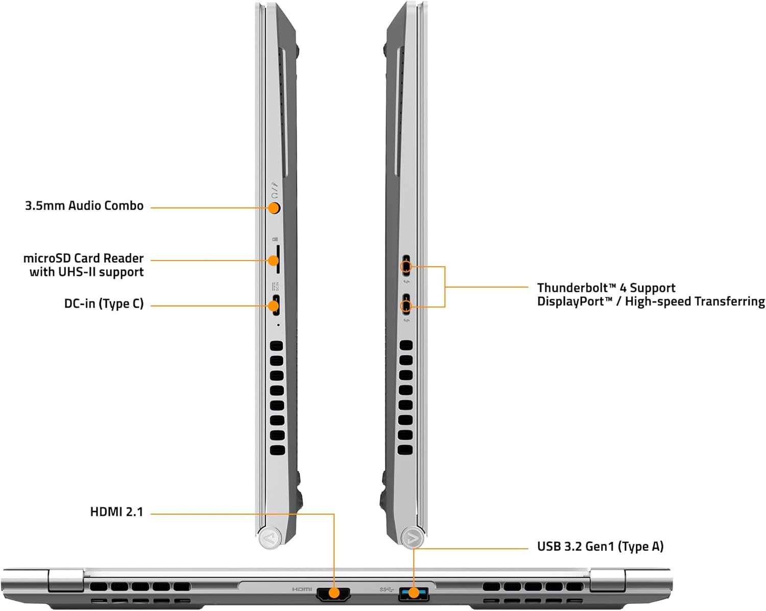 IO: 2x Thunderbolt 4, 1x HDMI 2.1, 1x USB 3.2 (Type-C), 1x USB 3.2 (Type-A), 1x microSD Card Reader with UHS-II Support, 1x RJ45, 1x Audio Combo Jack, 1x DC In (Type-C)