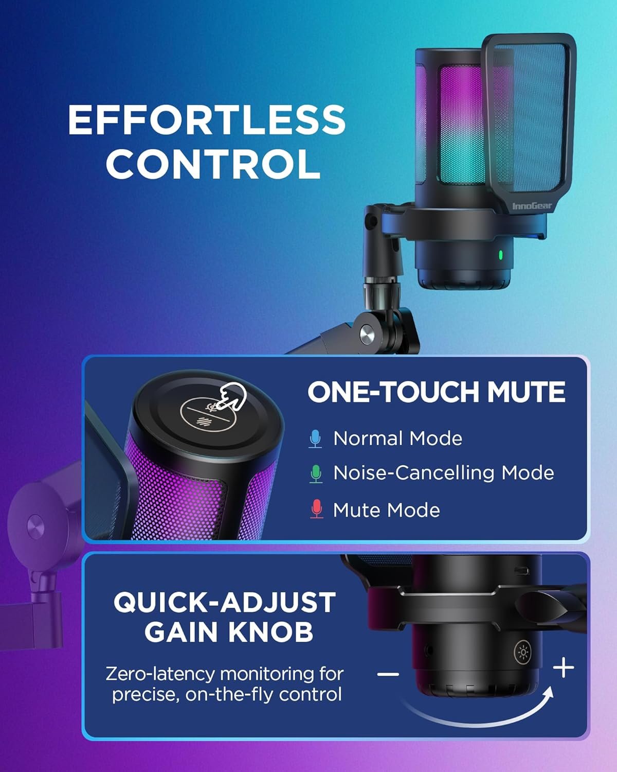 InnoGear USB Gaming Microphone Set, Noise Cancellation Condenser Mic with Boom Arm RGB Mute Headphones Jack for Streaming Podcasting Recording Vocal PC Computer YouTube Discord PS4 PS5, Black