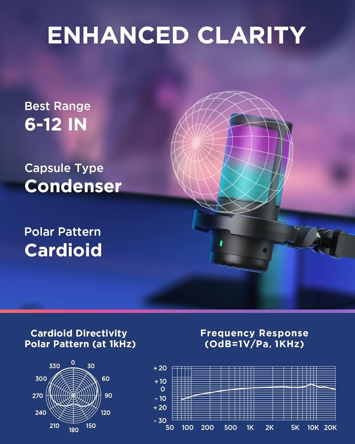 Crystal-Clear Voice Capture: The advanced condenser microphone for PC is equipped with upgraded cardioid condenser capsule, delivers smooth, crisp, and clear sound by focusing on your voice, reducing ambient noise during gameplay or streaming.