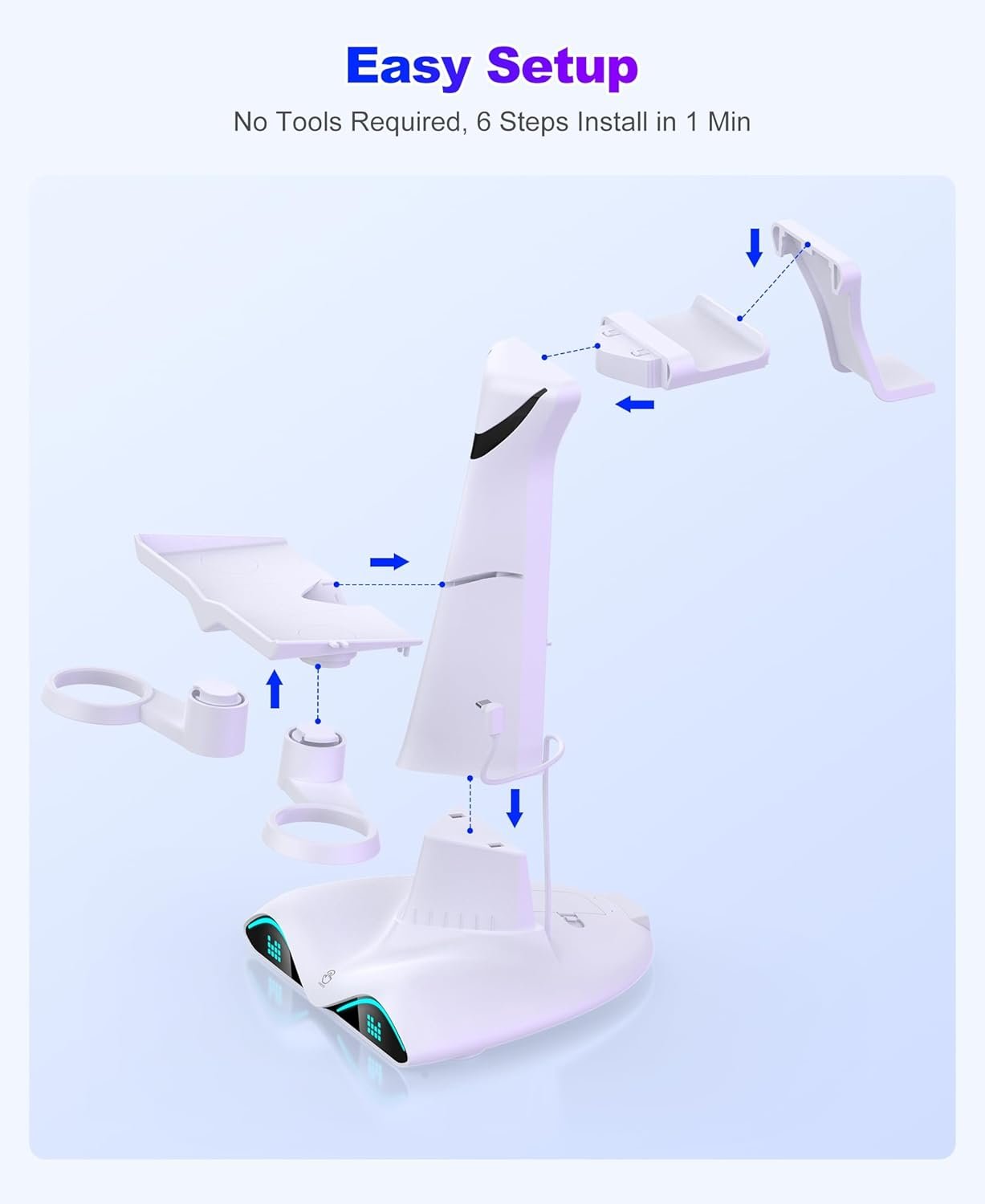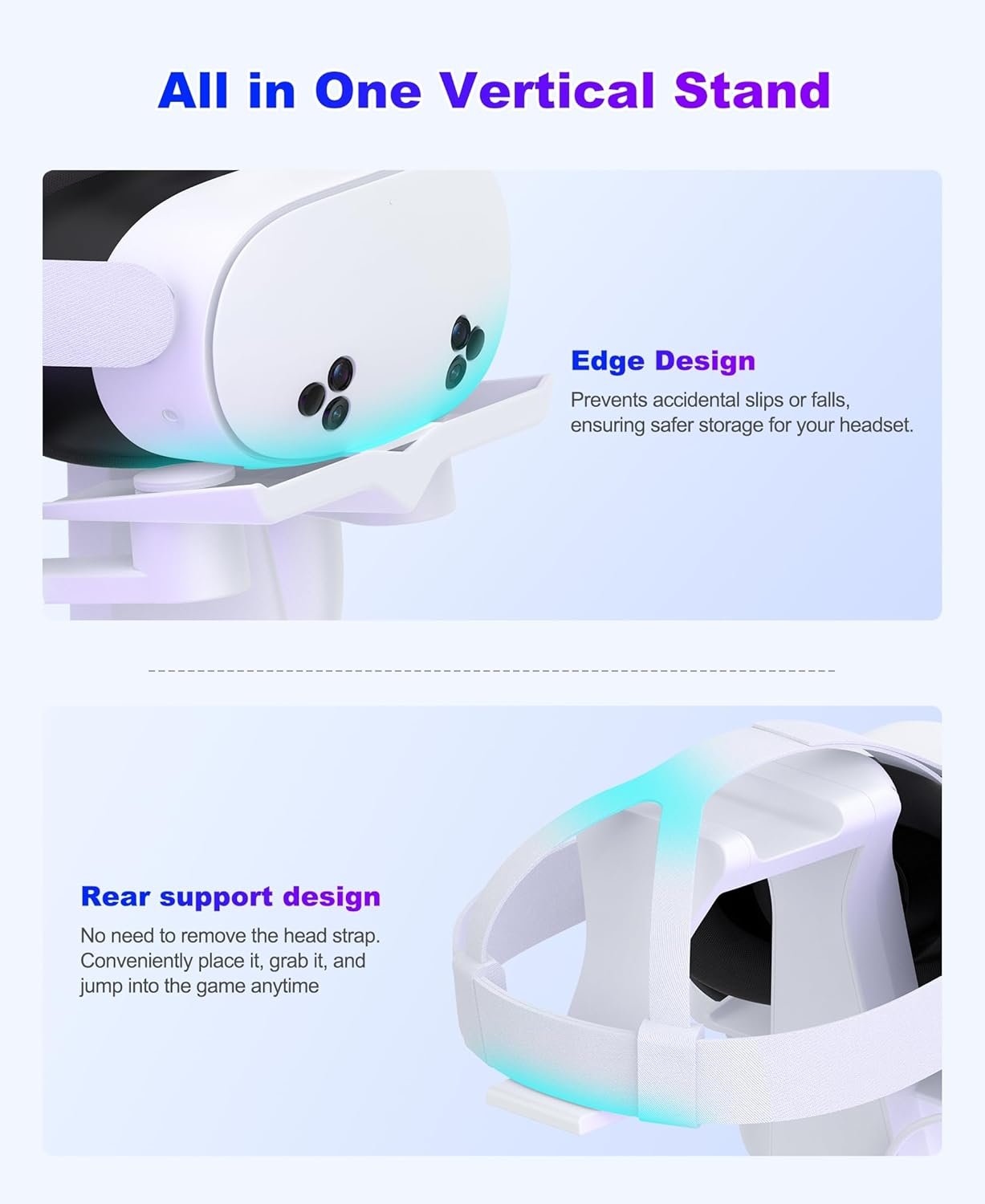 Universal Compatibility & Futuristic Design – Elevate your VR setup with this Compatible with Meta Quest 3/3S/2 charging dock. Compatible with oculus Quest 2/Quest 3/Quest 3S, this fast chariging vertical stand is perfect for securely stores and charges your Quest 3/3S/2, keep your headset, controllers, head strap in place. Its curved Type-C port allows charging without removing protective case or straps—featuring a sleek, space-inspired design that complements modern gaming aesthetics, this is ideal for Meta Quest accessories enthusiasts seeking style and functionality in one compact package
