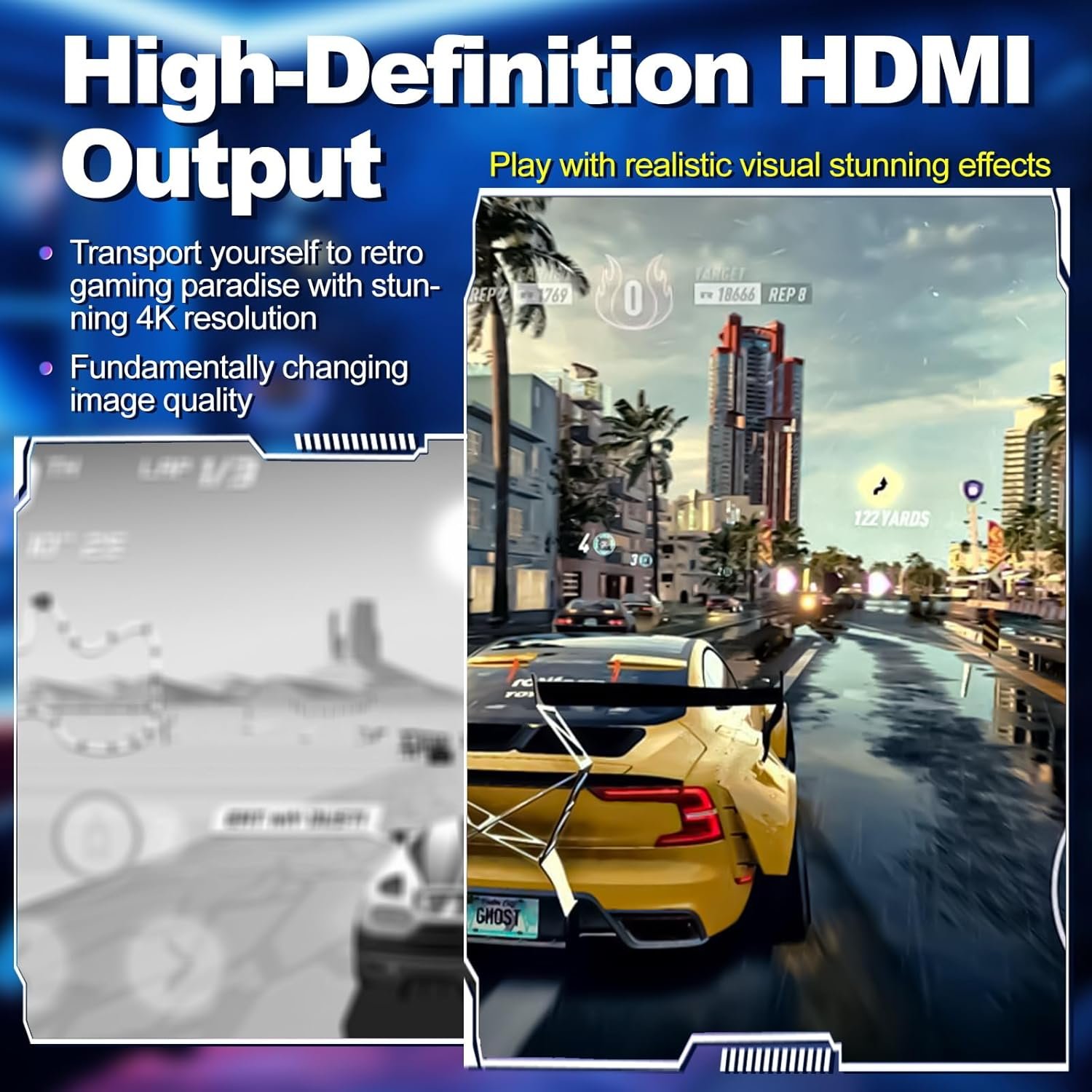 🖥 HDMI High-Definition Output: Connect effortlessly to TVs, monitors, and projectors via HDMI for a crisp and immersive gaming experience. Enjoy your favorite retro games in high resolution and smooth performance.