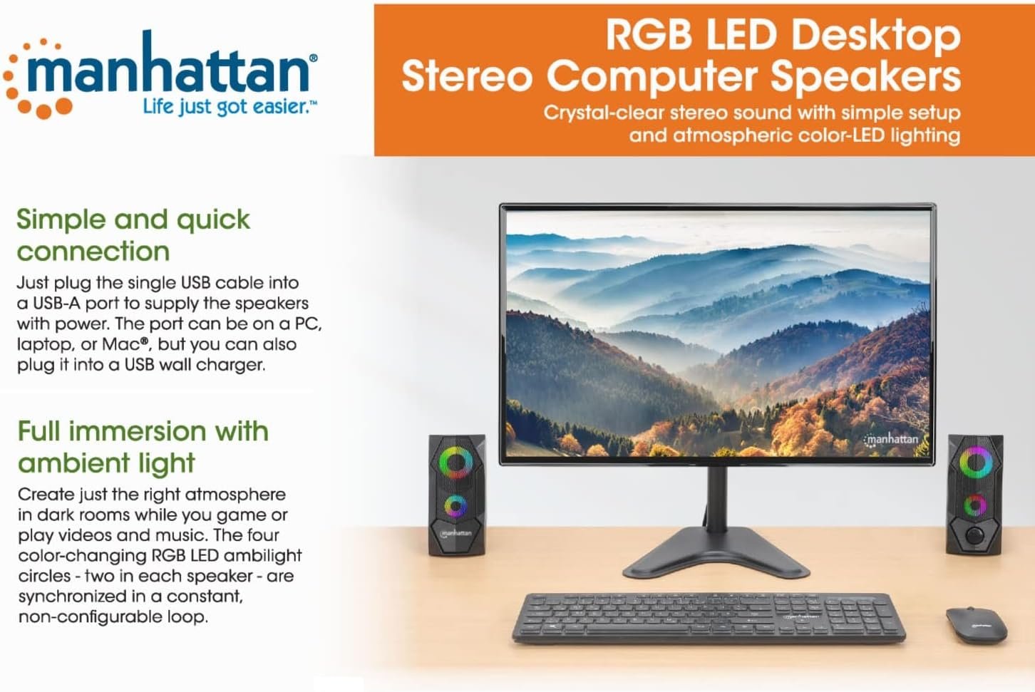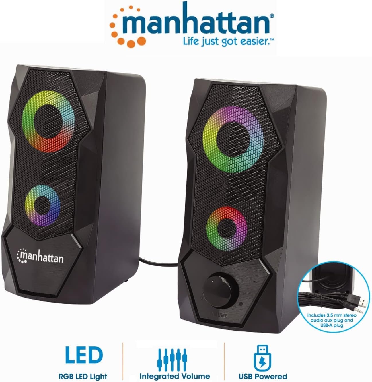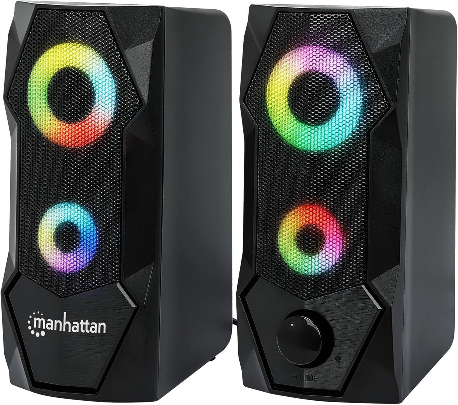 Manhattan USB Powered RBG Gaming Speakers – with Stereo Sound, Long 6ft Cord, Colorful Lights, Volume Control & 3.5 mm Audio Plug – for Computer, Monitor, Laptop, PC, Desktop -3 Yr Mfg Warranty–168359