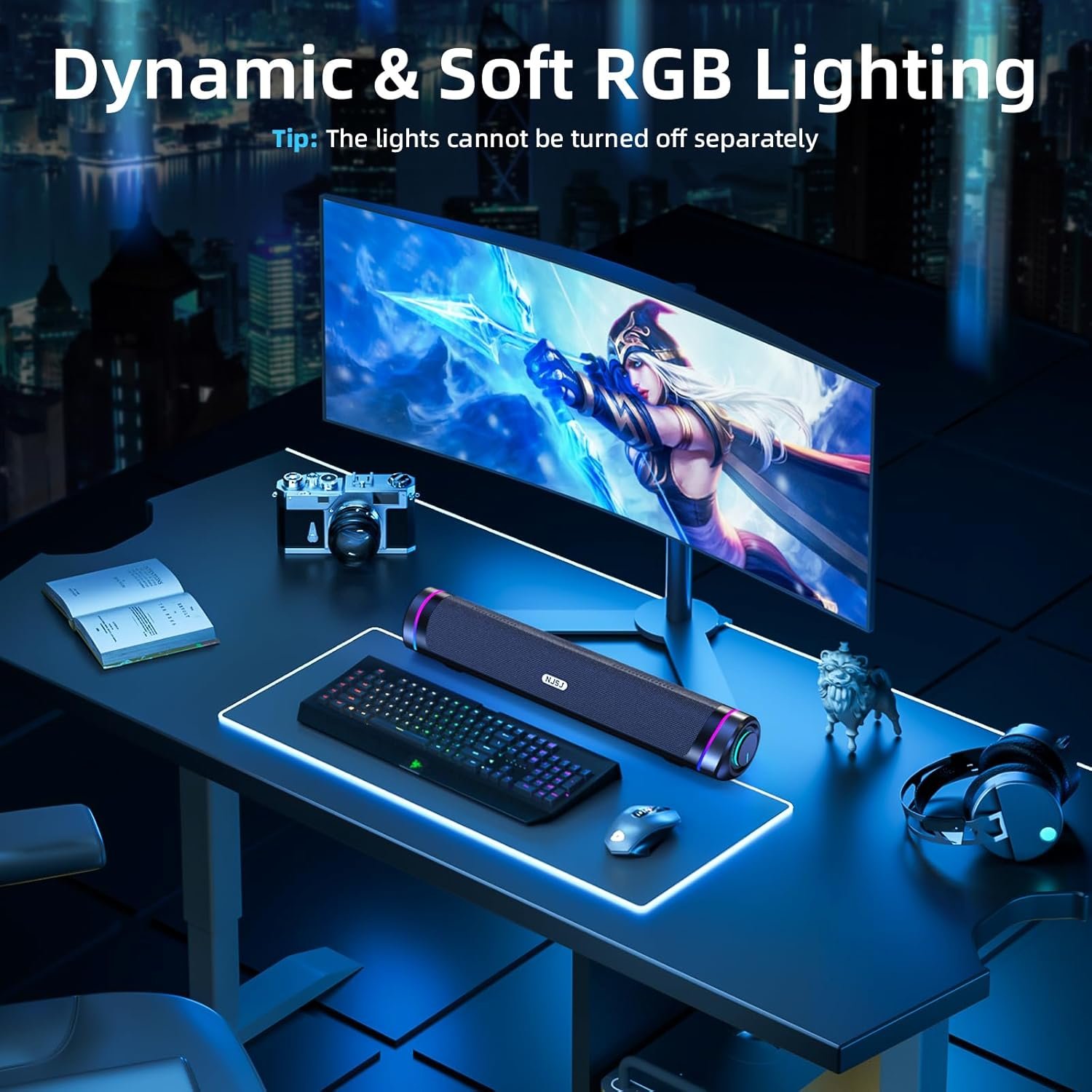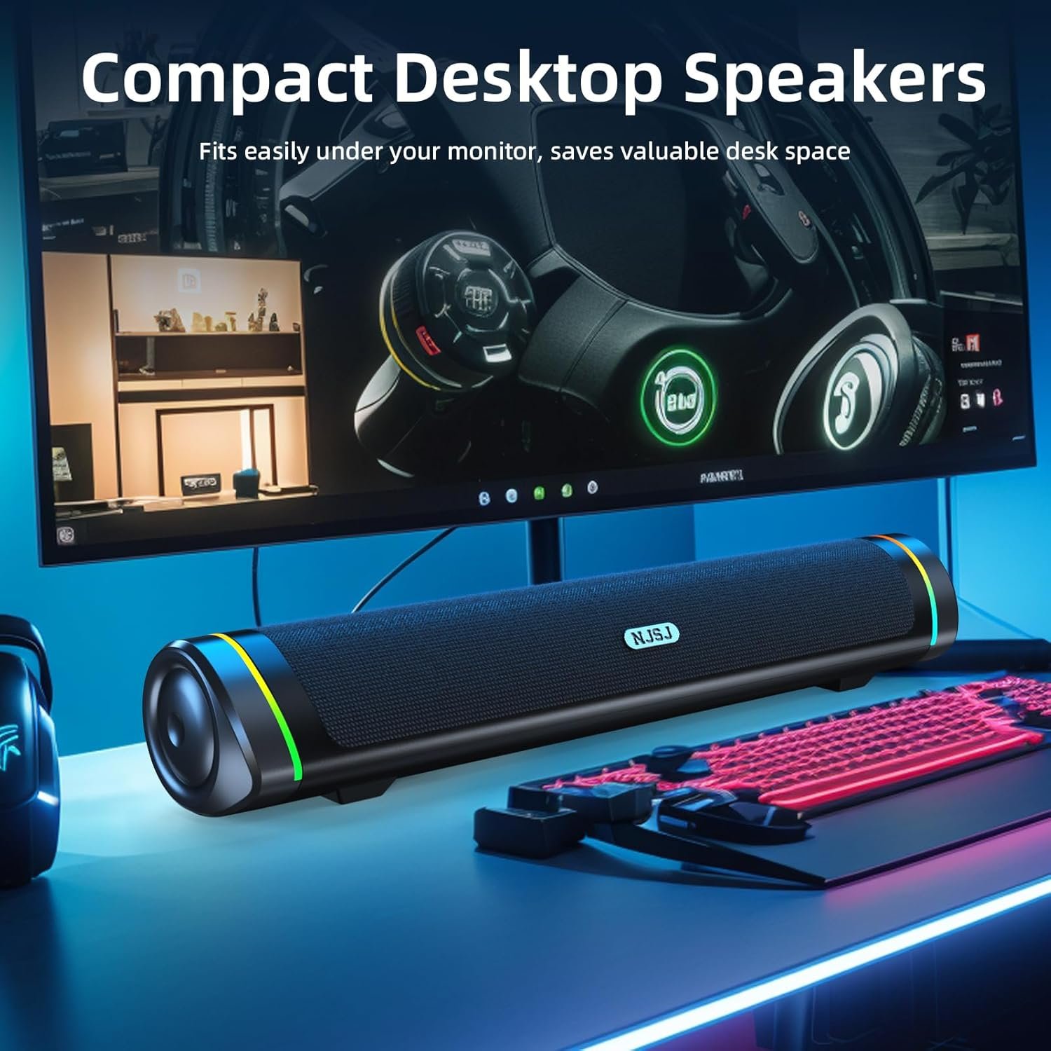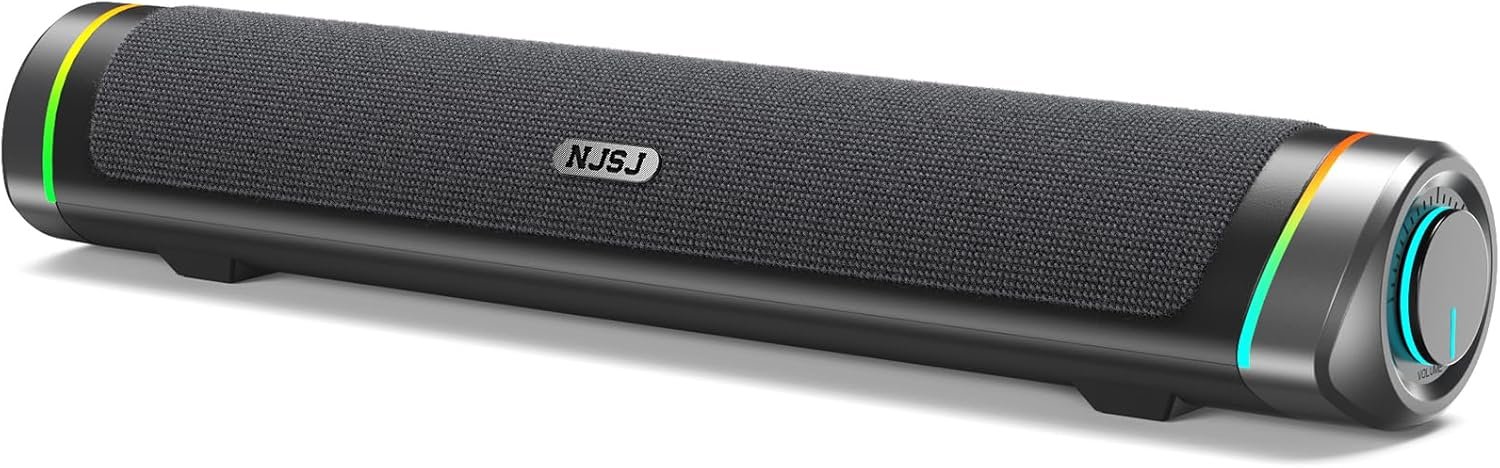 NJSJ Computer Speakers for Desktop with Clear Stereo Sound & Dynamic RGB Lighting, Compact Gaming Soundbar Speakers with USB Powered and 3.5mm Aux Input for PC, Laptop, Monitor