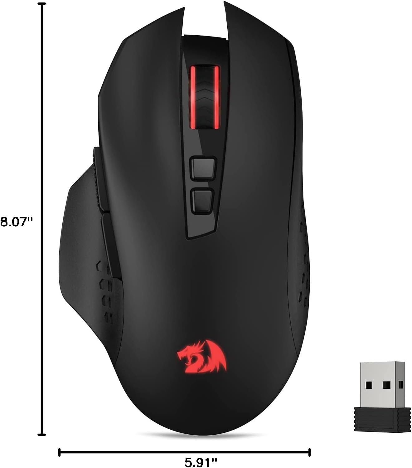 Red Backlight – When the mouse is ON, the redragon logo will light up red. But the scroll wheel backlight is not always on.