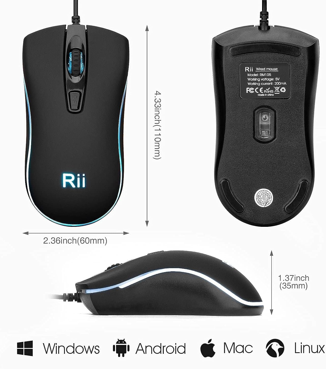 【Ergonomic & skin-friendly design】RM105 wired computer mouse with symmetrical & streamlined provides a comfortable claw-grip design, long-term use without fatigue. Top choice for computer user with anti-fingerprint and sweat-resistant that can keep your grip Firmly during using. Excellent wired PC wired mouse for casual using .