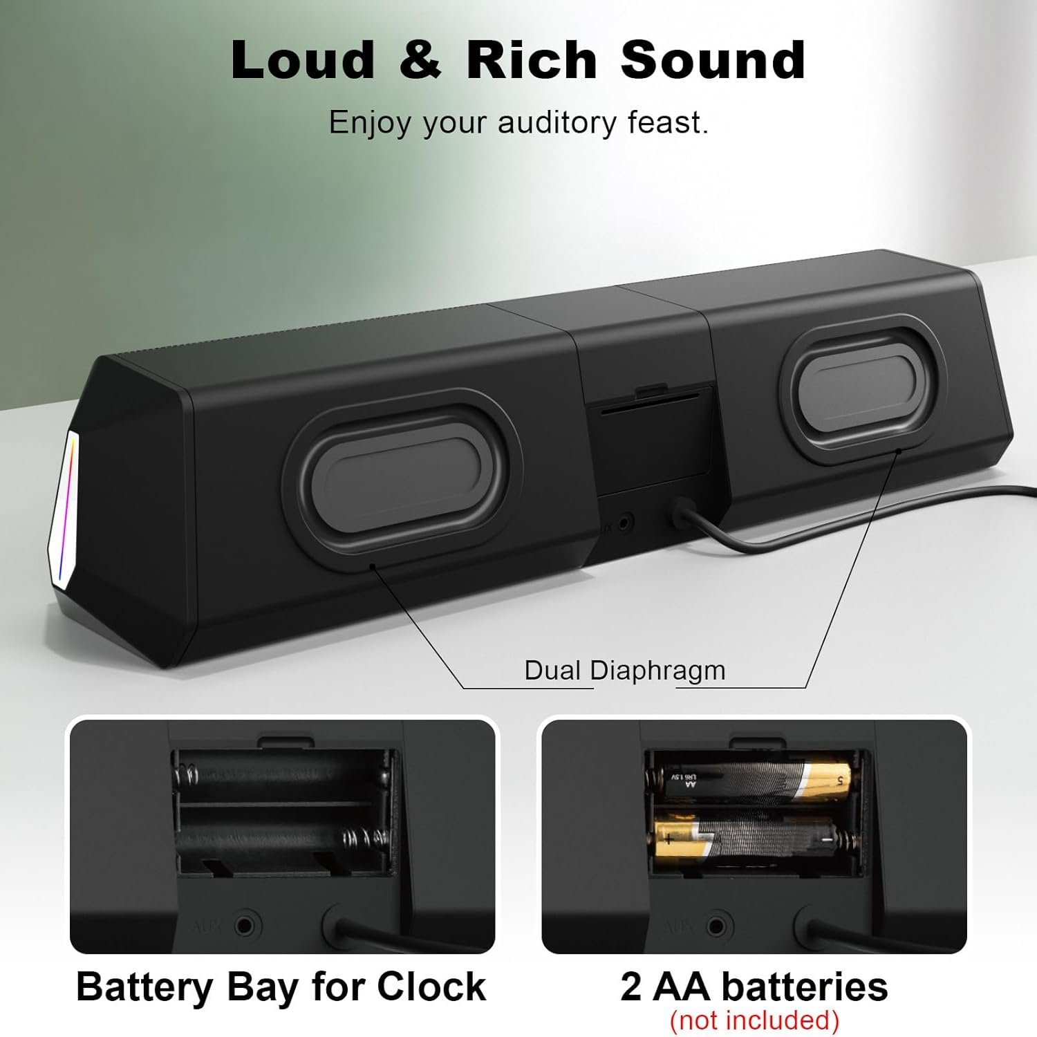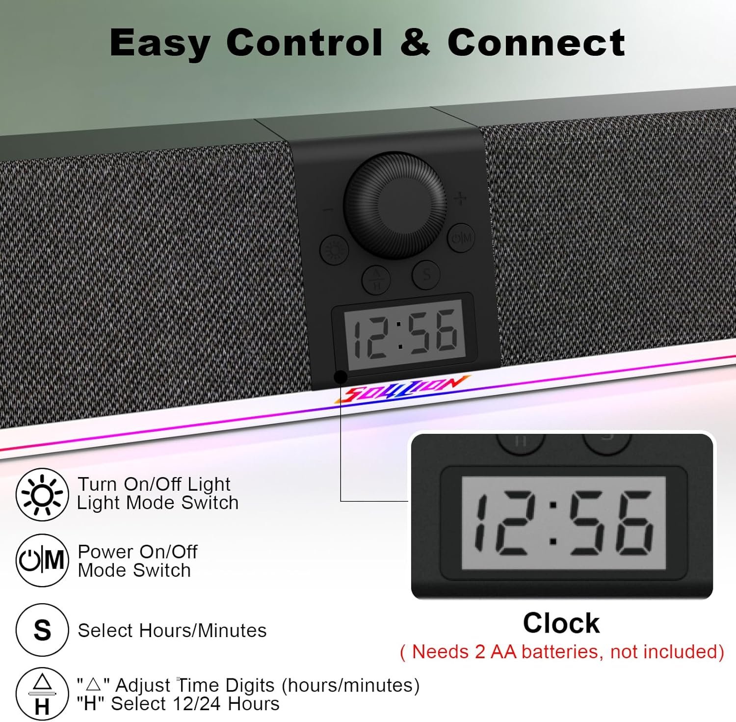 [LCD Clock Display] Newly upgraded Soulion R80 computer speakers are equipped with LCD Digital clock (2 AA batteries required but not included), to make it more convenient to check the time when shutting down your computer