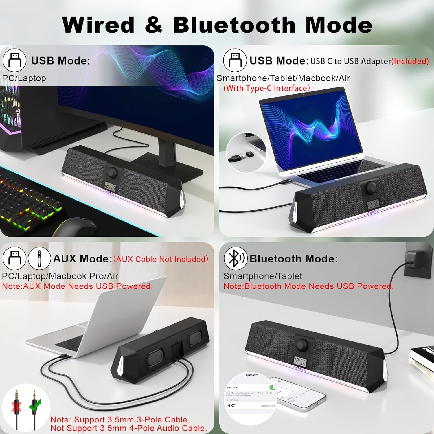 [USB Mode] Just plug in the USB port to power and play sound, press the “M” key to select “USB Mode”, the pc speaker for desktop is widely compatible with various devices, such as PC, laptop, tablet, smart phone, etc