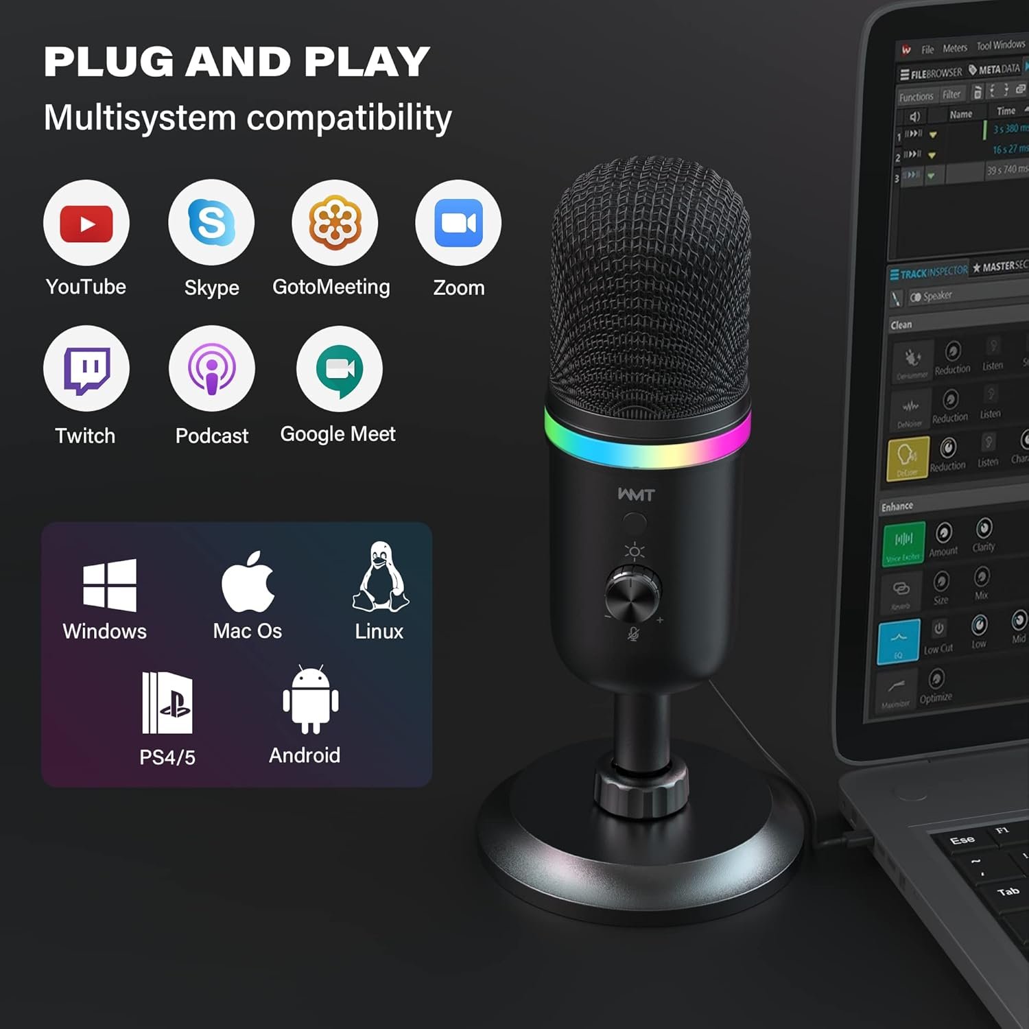 WMT USB Microphone – Condenser Gaming Microphone for PC/MAC/PS4/PS5/Phone- Cardioid Mic with Brilliant RGB Lighting Headphone Output Volume Control, Mute Button, for Streaming Podcast YouTube Discord