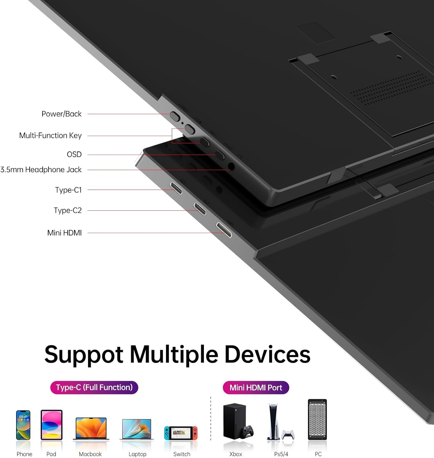 Double Type-C Port -For Plug & Play – Portable monitor features 2 full-featured Type-C ports and 1 MINI HDMI port. You can easily access your favorite devices with just one USB Type-C or MINI HDMI cable. NOTE: Your device should support Thunderbolt 3.0/4.0 or USB 3.1 Type C DP ALT-MODE.